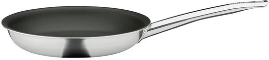 Het vijflaags materiaal van de koekenpan bestaat uit twee lagen roestvrij staal met een kern van drie lagen aluminium. Deze combinatie van materialen maakt de pan geschikt voor alle warmtebronnen, inclusief inductie. Tevens zorgt deze sandwich voor een snelle en gelijkmatige geleiding van de warmte, van het midden van de pan tot aan de rand.